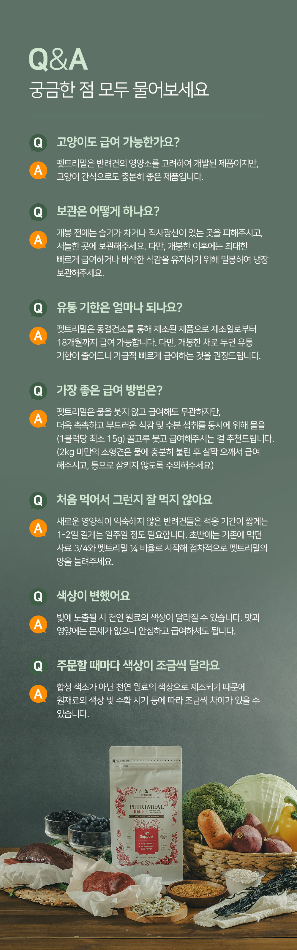 자연 속 레시피: 뉴질랜드산 양고기, 뉴질랜드산 양간, 양배추, 국내산 고구마, 당근, 캐나다산 아마씨, 브로콜리, 국내산 표고버섯, 국내산 멸치, 국내산 난각파우더, 국내산 미역, 인도산 보스웰리아, 국내산 백년초