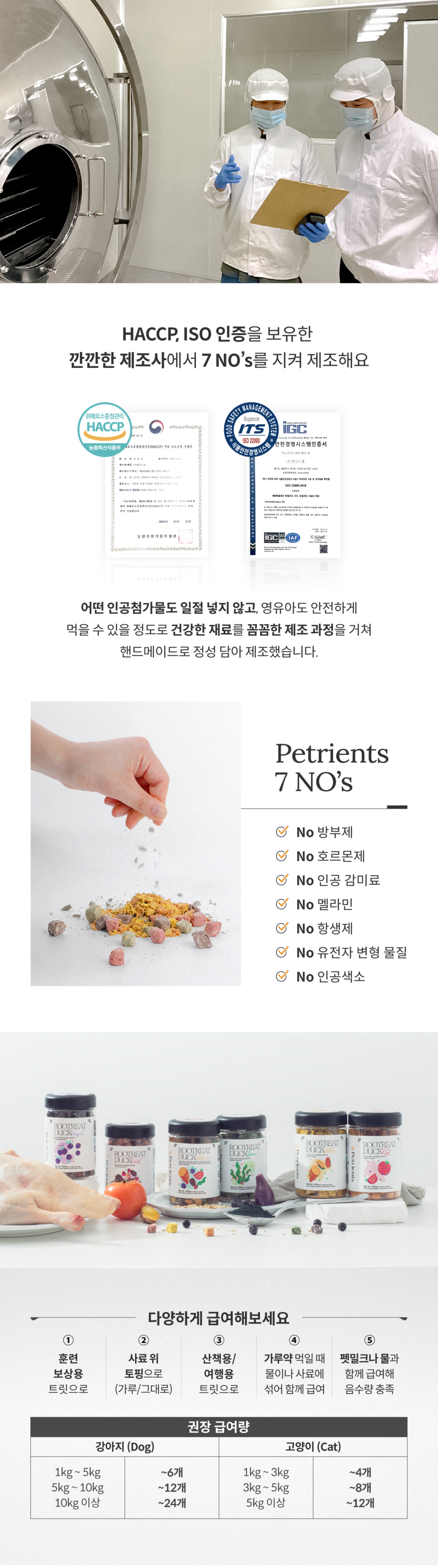 원산지까지 꼼꼼히 엄선된 자연 원물이 가진 본연의 맛과 색 그리고 영양을 그대로 담은 근본 반려동물 수제 동결건조 트릿 - 국내산 오리, 캐나다산 롤드오트, 미국산 스피루리나가 함유된 자연주의 강아지, 고양이 간식입니다.
