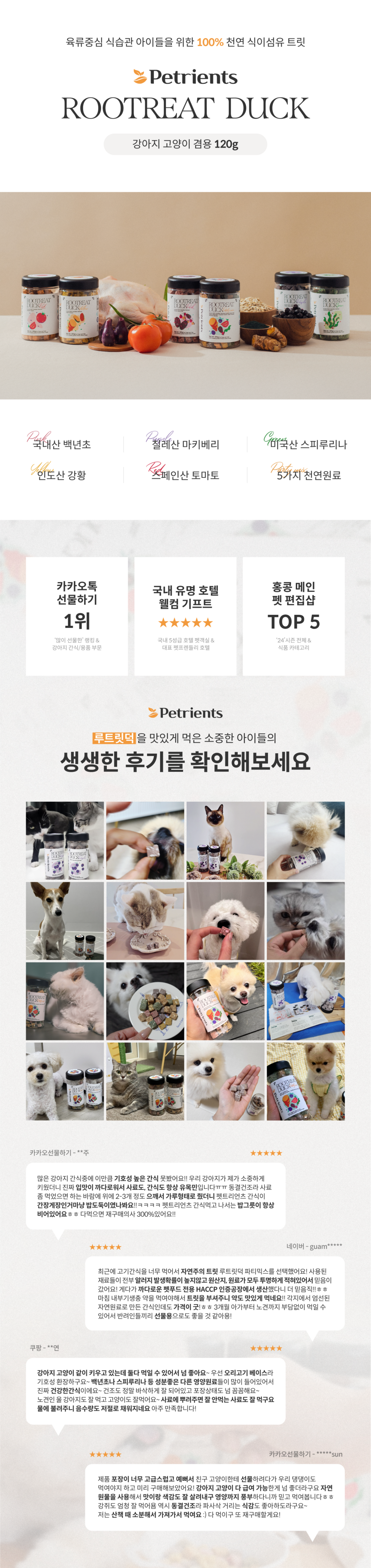국내산 오리, 캐나다산 롤드오트, 그리고 강아지 고양이 건강에 좋은 영양소가 함유된 귀한 5가지 천연 원료를 원산지 까지 엄선해 만든 알록달록한 근본 자연주의 트릿 훈련용 간식으로도 좋고, 음수량이 적을 경우 물 위에 가루내어 주면 음수량 충족에도 훌륭합니다.