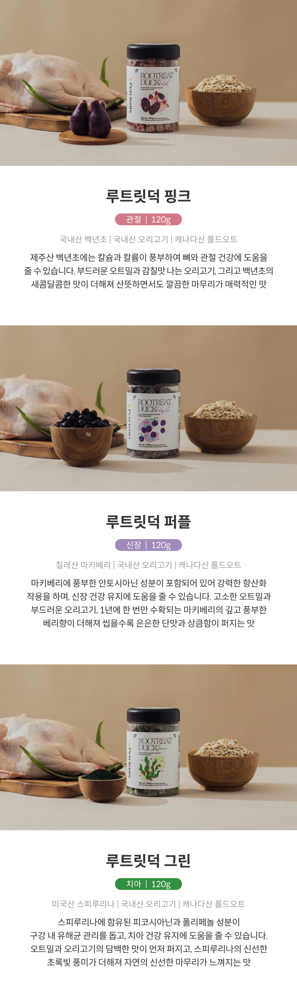 자연 속 레시피: 국내산 오리, 캐나다산 롤드오트, 칠레산 마키베리, 미국산 스피루리나, 국내산 백년초, 인도산 강황, 스페인산 토마토